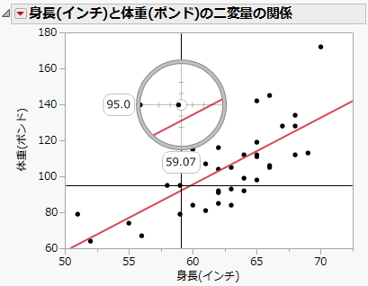 たとえば、回帰直線や回帰曲線上で、十字ツールをドラッグすると、応答変数の予測値が簡単にわかります。なお、三角図では、3本の線から成るカーソルが表示されます。