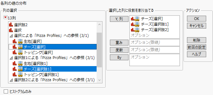 「Pizza Responses.jmp」で、名前が「選択」で始まる3つの列を選択します。