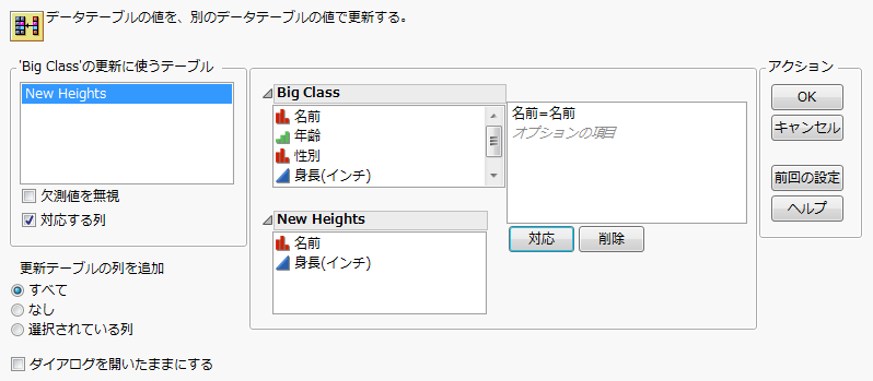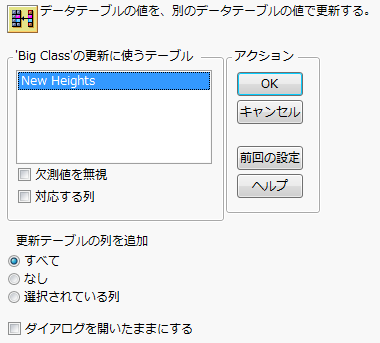 (オプション)元のテーブルの値を新しいテーブルの欠測値で置き換えないようにするには、[欠測値を無視]チェックボックスをオンにします。すると、新しいテーブルの値が欠測値の場合、元のテーブルの元の値がそのまま保持されます。