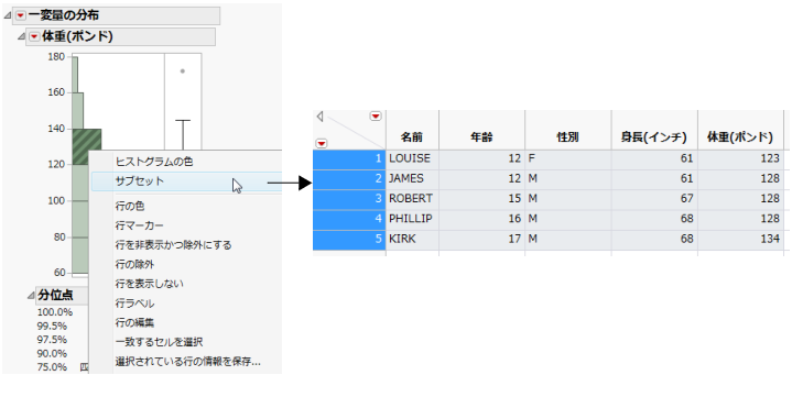 ヒストグラムを含むレポートを作成した後([分析]>[一変量の分布]を選択して作成)、そのヒストグラムを使って、強調表示した棒のデータを含む新しいデータテーブルを作成できます。