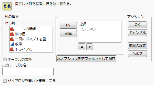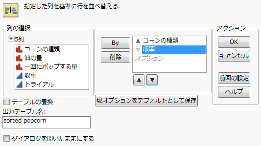 「出力テーブル名」のボックスに、並べ替え後の新しいテーブルの名前を入力します。この例では、「ポップコーン(並べ替え後)」と入力します。