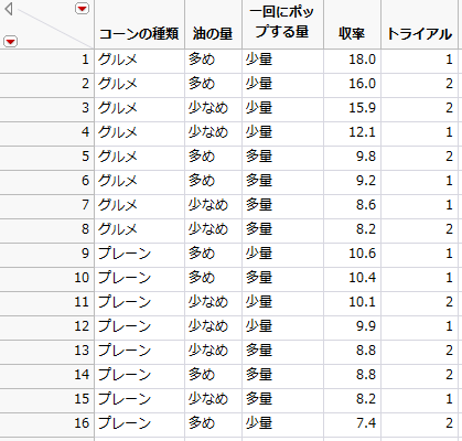 [ヘルプ]>[サンプルデータライブラリ]を選択し、「Popcorn.jmp」を開きます。