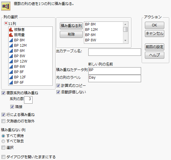 「BP」列をすべて選択し、[積み重ねる列]をクリックします。