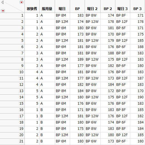 日時別に「BP」(血圧)列があります。たとえば、「BP 8M」列は月曜日の午前8時、「BP 12W」は水曜日の正午に計測したデータをそれぞれ表しています。この例では、血圧を示す列をすべて積み重ね、月曜日、水曜日、金曜日に対応する3つの列に整理しましょう。