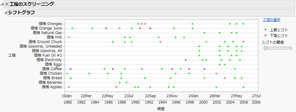 以下の例では、「Consumer Prices.jmp」サンプルデータを例に、グループ変数列の使い方とシフトグラフについて説明します。