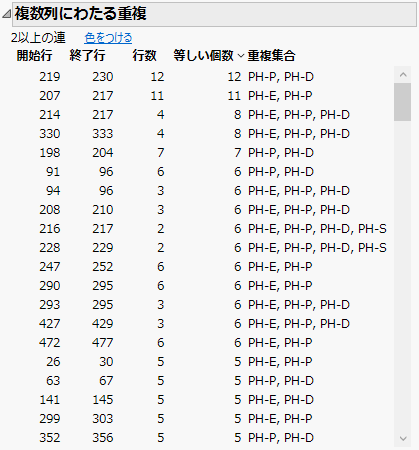 更新された「複数列にわたる重複」レポートを見ると、10以上の連を持つ重複セットが2つあることがわかります。どちらのセットにも「PH-P」列が含まれています。