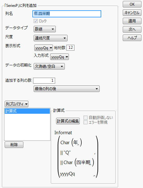 ここでは、「SeriesP.jmp」サンプルデータを使用して時系列分析を行います。まず、時間IDに適した新しい列を作成します。