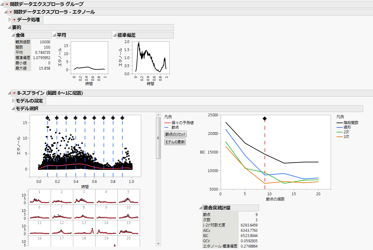 8. 「関数データエクスプローラ グループ」の赤い三角ボタンをクリックして、[モデル]>[B-スプライン曲線]を選択します。これにより、B-スプラインモデルが各出力変数に対してあてはめられてます。