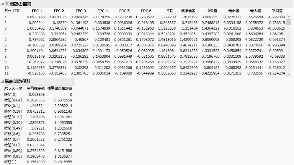 この例では、まず「関数データエクスプローラ」プラットフォームを使用して、モデルをデータにあてはめ、それらに関数主成分分析を行います。そして、関数主成分分析の結果を新規作成されたデータテーブルに保存します。その後、関数主成分分析の結果を、「モデルのあてはめ」プラットフォームの一般化された回帰手法で分析されます。