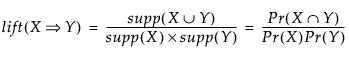 リフト値の分子は、X とYが一緒に生じるトランザクションの割合です。分母は、XとYが独立して生じると仮定した場合にXとYが一緒に生じる割合の期待値です。