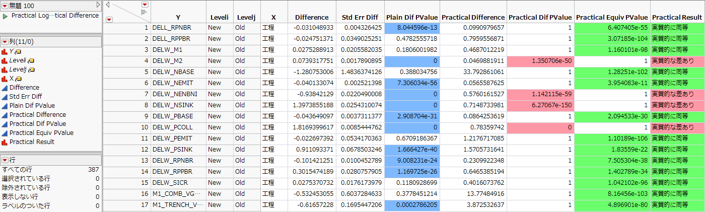 平均の比較に関するデータテーブルには、実質的な差に対する検定と、実質的な同等性に対する検定の結果が含まれています。各行の結果は、カテゴリカルな因子の水準の各ペアにおいて応答を比較したものです。結果は色分けされており、有意性が分かりやすくなっています。実質的な差の指定方法については、Practical Differenceを参照してください。例については、実質的な差や実質的な同等性に対する検定の例を参照してください。