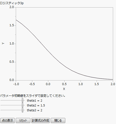 [グラフの表示]をクリックすると、モデルに説明変数が1つしかない場合は2次元上に曲線を、2つある場合は3次元上に曲面プロットを表示します。説明変数(X)が3つ以上あるモデルでは、グラフが作成されません。グラフウィンドウでは、スライダを使うか値を入力することによって、パラメータの初期値を変更できます。
