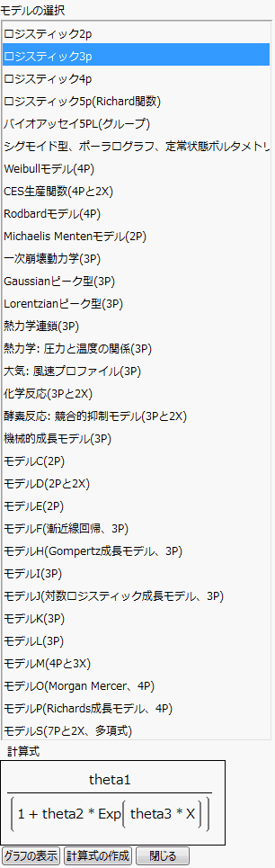 モデルライブラリは、パラメータおよびその初期値が設定された計算式を作成するのに便利です。「非線形回帰」起動ウィンドウの[モデルライブラリ]ボタンをクリックすると、ライブラリが開きます。リストでモデルを選択すると、その計算式が「計算式」ボックスに表示されます。