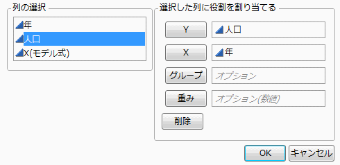 注: [グラフの表示]ボタンまたは[点の表示]ボタンをクリックする前に[計算式の作成]をクリックした場合は、XとYの役割と、オプションとしてグループ変数を指定するよう求められます(図14.9)。変数を指定するとプロットに戻り、必要に応じてパラメータの初期値を調整できます。そこで再び[計算式の作成]をクリックすると、新しい列が作成されます。