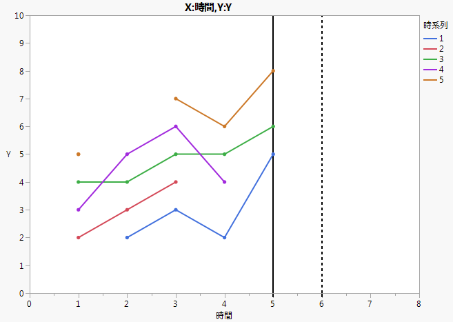 • 時系列はすべて同じ最終観測時点まで収集されている。この最終観測時点は、個々の時系列のいずれかで発生した最も遅い時点として定義されます。最終観測時点までのデータがない時系列は、欠測値があると仮定されます。たとえば、図18.5の場合、最終観測時点は5であり、黒い実線で表されています。時系列2は時点4と5において欠測値があり、時系列4は時点5において欠測値があります。