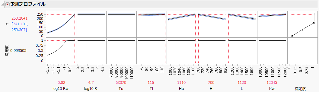 満足度関数は応答変数Yを最大化するように設定されています。これは、データテーブルのY列に対しては、「応答変数の限界」列プロパティが設定されており、そこで「目標」を「最大化」するように指定されているからです。満足度関数を最大化することにより、応答を最大化する因子の値を識別できます。陰影のついた帯は95%信頼区間を表しています。