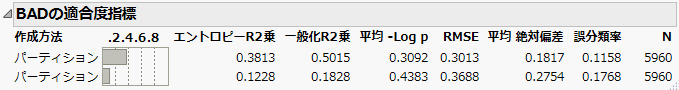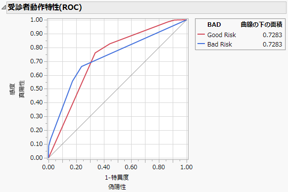 注: [欠測値をカテゴリとして扱う]を使わなかった場合、得られるAUCは分析ごとに変化します。[欠測値をカテゴリとして扱う]を使わなかった場合、欠測値を含む行は、分岐のいずれかに無作為に割り当てられます。そのため、分析を再実行すると、結果がわずかに異なります。