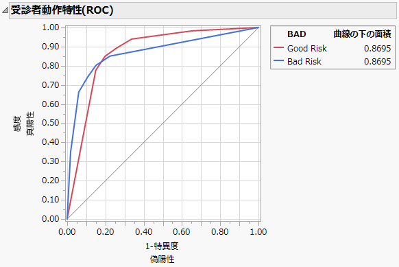 [欠測値をカテゴリとして扱う]を使ったモデルの曲線の下の面積(AUC; Area Under Curve)(0.8695)は、[欠測値をカテゴリとして扱う]を使わなかったモデルのAUC(0.7283)より大きくなっています。この例の応答変数は2水準なので、一方の水準のROC曲線は他方の水準のROC曲線と対角線で対称となっています。また、それら両者のAUCは等しいです。