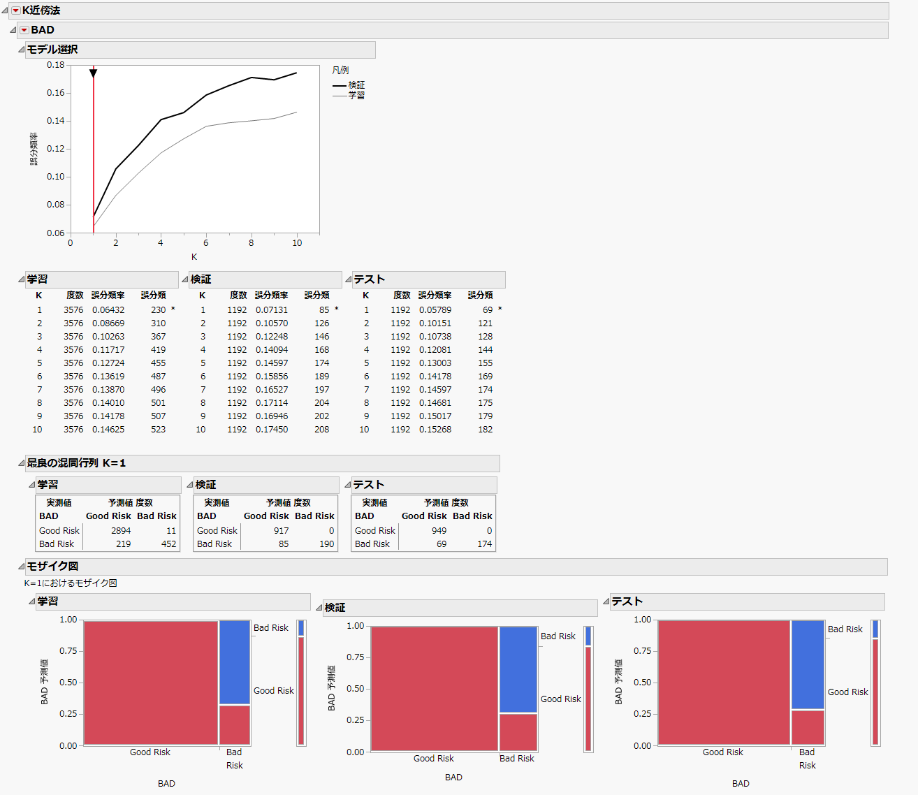 JMPは、学習セットのオブザベーションだけを使用して、Kの値ごとにモデルをします。そして、その作成された各モデルに対して、検証セットのデータが分類されます。検証セットの結果は、最良のモデルを選択するのに使用されます。この例において、1つの近傍点(K = 1)に基づいたモデルの誤分類率が最も小さくなっています。また、テストセットでも、1つの近傍点(K = 1)に基づいたモデルの誤分類率が最も低いです。