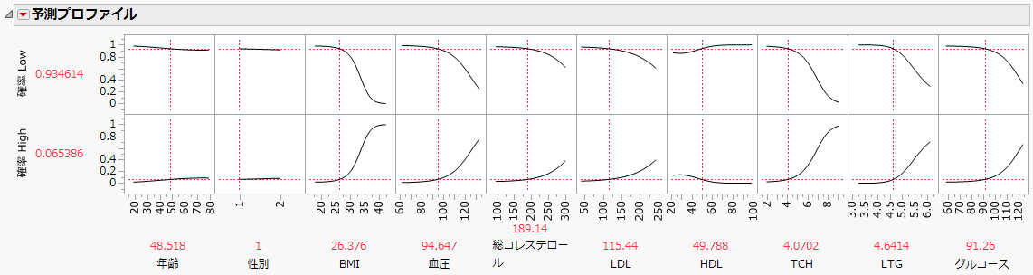 「周辺モデルプロット」レポートの2段目のプロットからは、「HDL」が高い患者は「High」に分類される確率が低いことがわかります。また、「BMI」と「LTG」が高い患者は、「High」に分類される確率が高くなっています。