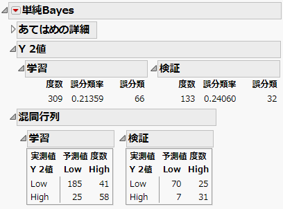 誤分類率は、学習セットで約21%、検証セットで約24%です。「混同行列」を見ると、学習セットと検証セットのどちらも、病気の進行が「High」である患者よりも、「Low」である患者のほうで誤分類が多く発生しています。検証セットの結果は、独立したデータでもある程度の分類が行えることを示唆しています。