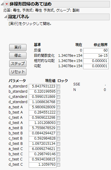 「非線形回帰のあてはめ」ウィンドウが表示されます。設定パネルに、パラメータ値と固定オプションが表示されます。各パラメータの前に表示されているアルファベットは、「曲線のあてはめ」プラットフォームの「予測モデル」でのモデル式で使われている変数に対応しています。