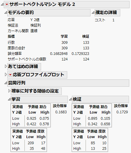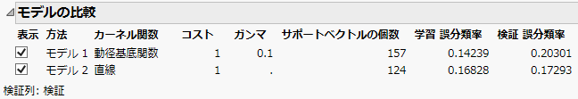 「モデルの比較」レポートを見ると、誤分類率に関して最も良いモデルが、コストパラメータ1の直線カーネル関数を使ったモデルであることがわかります。このモデルをさらに分析します。