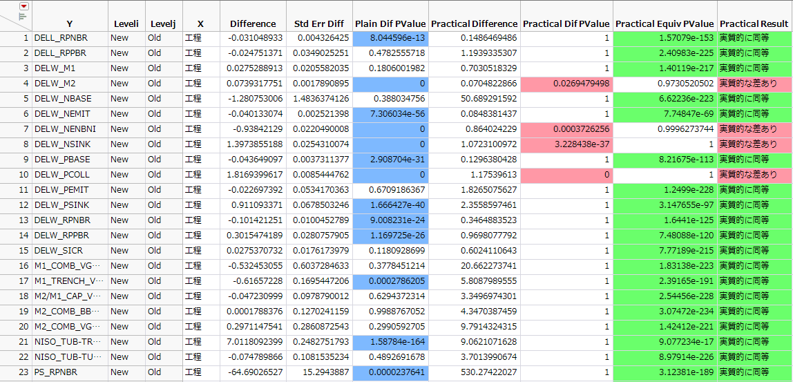 「Plain Dif PValue」列では、「差がゼロである」という帰無仮説に対して有意である応答を確認できます。「Practical Diff PValue」列と「Practical Equiv PValue」列には、実質的な差と実質的な同等性に対する検定のp値が表示されます。多数の比較において、「差がゼロである」という帰無仮説に対する検定には統計的有意差を示しています。しかし、実質的有意差を示しているものは多くありません。