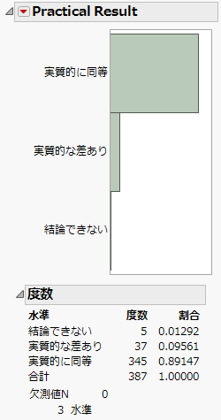 「Probe.jmp」には仕様限界が列プロパティとして保存されていないため、応答ごとに実質的な差が自動的に設定されます。実質的な差として指定した0.15に、応答の6s範囲を掛け合わせて求めた値が、実質的な差と同等性の検定に使用されます。この値は、「Practical Difference」列に表示されます。