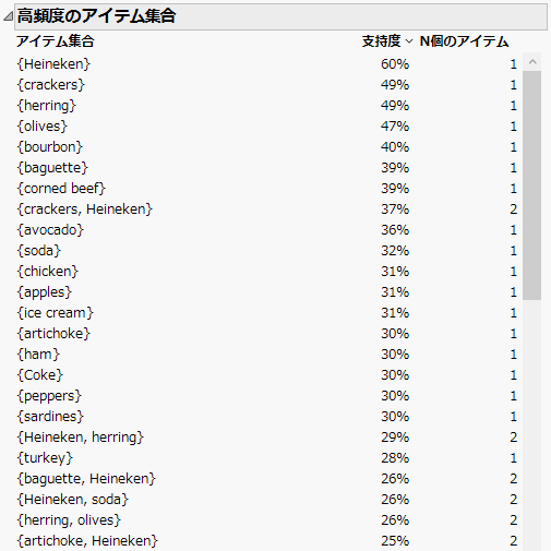 「高頻度のアイテム集合」がアイテム集合のアルファベット順に並べ替えられます。リストをスクロール して、条件アイテム集合({chicken, ice cream})の支持度が14%であることを確認します。帰結アイテム集合({Coke, sardines})の支持度は15%です。このアソシエーションルールでは、リフト値が高いものの、トランザクション数は最初に検討したアソシエーションルールより少ないです。
