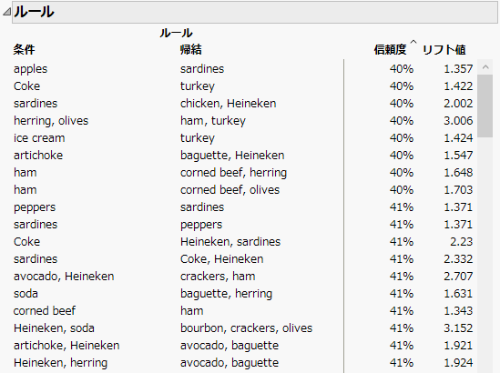 「ルール」表がリフト値の降順で並べ替えられます。2番目のアソシエーションルールを見ると、リフト値は5.642、信頼度は83%です。この場合、条件集合({chicken, ice cream})と帰結集合({Coke, sardines})の支持度が適切な値であることを確認する必要があります。