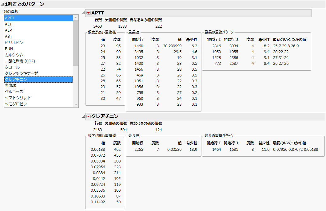 「列の選択」リストで列名を選択するにつれ、対応する列のレポートが表示されます。「APTT」レポートを見ると、この列には度数が3の連と度数4のパターンがいくつか含まれていることがわかります。「クレアチニン」レポートからは、この列が、最長連の希少性スコアが最も高い列ではあるが、そこには連が1つしかないことがわかります。また、この列には、度数が8のパターンが1つあります。