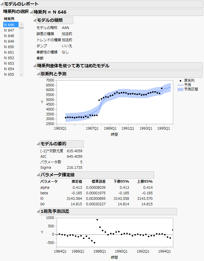 1つの時系列「N 646」のモデルレポートが表示されます。これは、「時系列の選択」リストで選択されている時系列の名前に対応しています。下矢印キーを使用して、各時系列のモデルレポートを見ていくことができます。別の方法として、リスト内で別の名前をクリックして、その時系列のモデルレポートを表示してもかまいません。