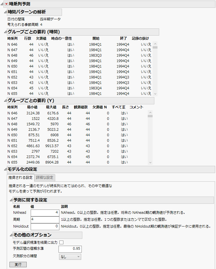 最初の「時系列予測」レポートが表示されます。ここには、「時間」変数と「Y」変数の要約があります。また、予測モデルをあてはめるためのオプションを含む「モデル化の設定」レポートもあります。