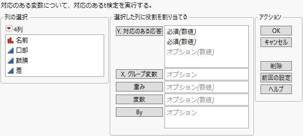 「対応のあるペア」プラットフォームを起動するには、[分析]>[発展的なモデル]>[対応のあるペア]を選択します。