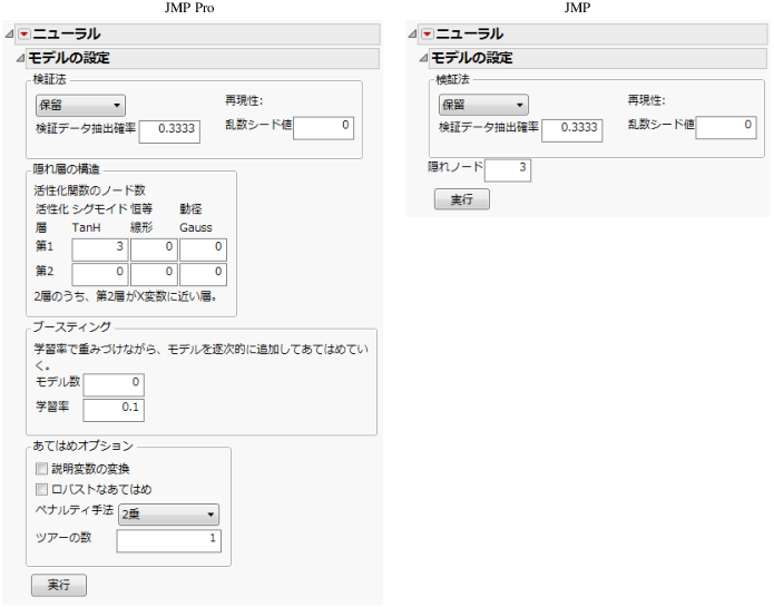 注: JMPの標準バージョンでは、活性化関数としてTanH関数しか使用できず、また、隠れ層が1つのニューラルネットワークしかあてはめられません。