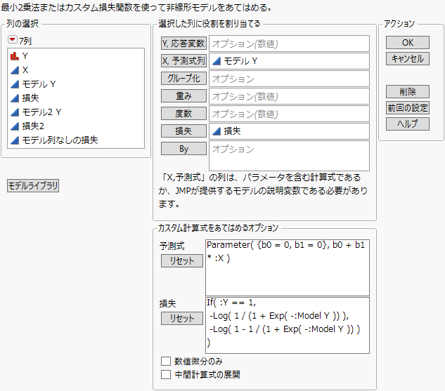 注: ここで指定された列が、パラメータをもつ計算式としてモデル式が表されているものでない場合で、かつカスタム計算式を指定しない場合は、代わりに「曲線のあてはめ」プラットフォームが起動します。