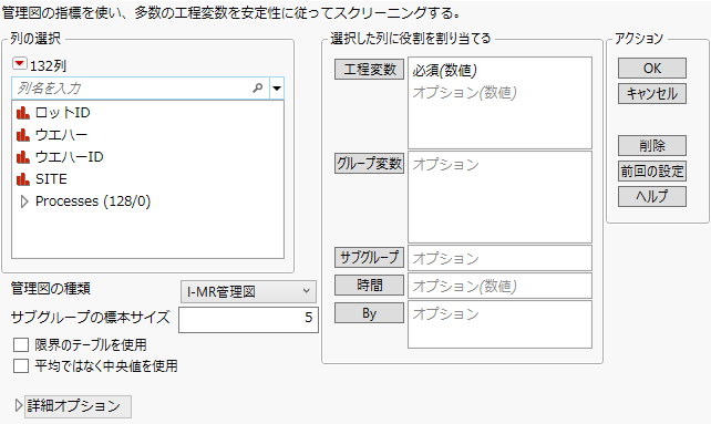 分析したい測定値を含む工程データの列。データタイプは「数値」でなければなりません。指定された工程変数の列に「管理限界」列プロパティが設定されている場合、「工程のスクリーニング」プラットフォームはそれらの値から指定されたシグマを計算し、それらの値を管理図の管理限界に設定します。