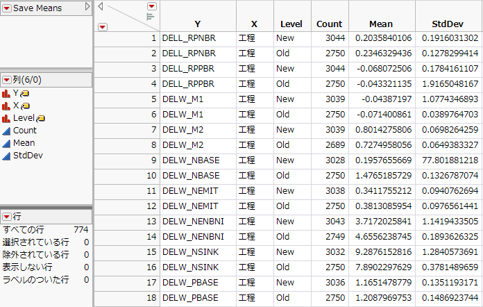 [平均の保存]オプションによって保存されるデータテーブルには、X変数の水準ごとに、各Y変数の平均と標準偏差が出力されます。「Probe.jmp」サンプルデータの場合、387変数のY変数が、「工程」という2水準因子に対して検定されます。この場合、平均のデータテーブルには387×2 = 774の行が含まれます。