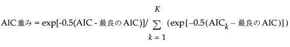 Kはモデルの合計数、AICkはモデルkのAICです。また、「最良のAIC」は、あてはめたモデルのAICのうち、最小となっているAICです。