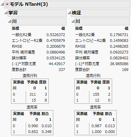 ニューラルネットワークをあてはめると、レポートが作成されます。学習セットと検証セットに対し、適合度指標が計算されます。また、応答変数が名義尺度または順序尺度の場合は、混同行列が表示されます。