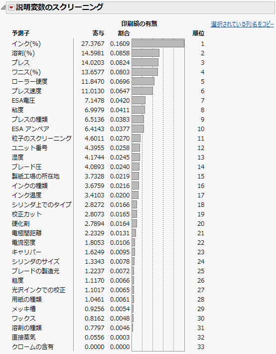 「説明変数のスクリーニング」は、「応答のスクリーニング」とは異なります。「応答のスクリーニング」は、説明変数を1変数ずつ検定します。「説明変数のスクリーニング」では、ブートストラップ森を使い、応答変数に対する各説明変数の寄与度を評価します。このブートストラップ森は、モデルのなかに複数の説明変数を含んでいます。「説明変数のスクリーニング」では、たとえ1変数だけでは弱かったとしても、他の説明変数と組み合わされたときに強い予測能力を持つような説明変数を特定します。応答のスクリーニングを参照してください。