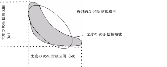 • 漸近標準誤差によって近似される領域は楕円です。また、この近似による信頼区間は、楕円の極値(水平接線と垂直接線での値)になります。