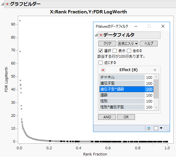 11. 「データフィルタ」のリストボックスで効果を順次クリックし、それに応じて「Rank Fraction」と「FDR LogWorth」のグラフで選択される点を確認します。