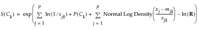 所定のクラスCkに対する「単純 スコア」S(Ck)の計算式は、P(Ck|(x1,..., xp))における分子の式を変形したものであり、次のとおりです。