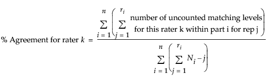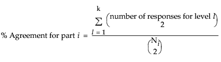 • Ni = m x ri。部品i (i = 1,...,n)の判定回数。これには、判定者全員を表す応答と、部品ごとの繰り返しの判定も含まれます。たとえば、部品iが3人の判定者により3回判定された場合、Niは3 x 3 = 9となります。