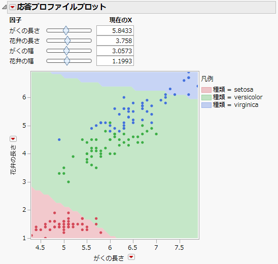 モデル分類は、応答プロファイルプロットで視覚化できます。「サポートベクトル」プラットフォームには、モデルがどのくらいよくデータにあてはまるかを判断するために、誤分類率、混同行列、ROC曲線、およびリフトチャートの機能が備わっています。