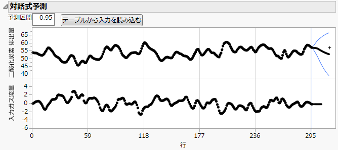 「対話式予測」レポートでは、「伝達関数モデルの指定」ウィンドウで指定された予測間隔に基づいて予測グラフが表示されます。予測値の予測区間が青色で表示されます。予測区間の信頼水準を変更するには、グラフの上にある「予測区間」ボックスに数値を入力します。