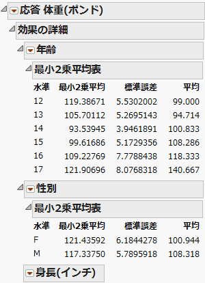 「効果の詳細」レポートには、3つの効果それぞれのレポートが表示されます(図3.10)。「年齢」と「性別」には最小2乗平均表が表示されていますが、連続尺度の効果である「身長(インチ)」には表示されていません。最小2乗平均が標本平均とどのように異なるかに注目してください。