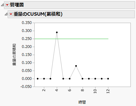 起動ウィンドウでHに対して指定した値の位置に、決定限界の水平な線が描かれます。この例では、その値は0.25です。この決定限界(0.25)を超えるものは、工程にシフトが生じたか、工程が管理外の状態であることを示唆します。この例では、4つ目でシフトが生じていると判断できます。片側CUSUM管理図では、Vマスクではなくて、水平な決定限界が使われます。